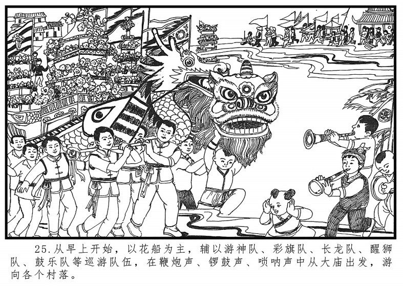 25.从早上开始,以花船为主,辅以游神队、彩旗队、长龙队、醒狮队、鼓乐队等巡游队伍,在鞭炮声、锣鼓声、唢呐声中从大庙出发,游向各个村落。