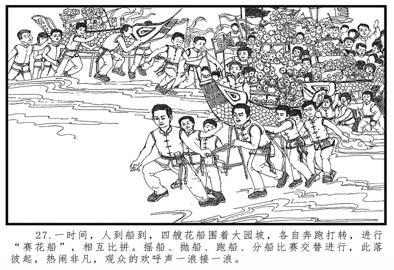 27.一时间,人到船到,四艘花船围着大园坡,各自奔跑打转,进行“赛花船”,相互比拼。摇船、抛船、跑船、分船比赛交替进行,此落彼起,热闹非凡,观众的欢呼声一浪接一浪。