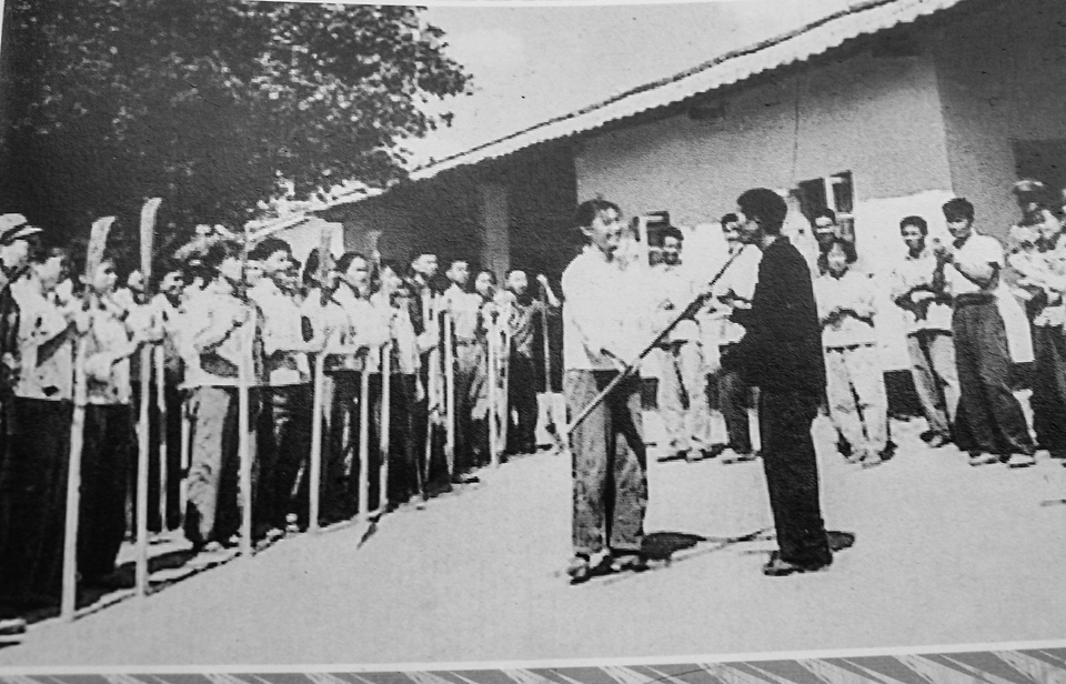 1968年12月,毛主席提出了“知识青年到农村去,接受贫下中农的再教育,很有必要”的指示,全国各地掀起了城市知青到农村去、到农场去、到边疆去、到祖国最需要的地方去的热潮。在这个热潮中,广州、汕头、湛江、化州、高州等一批知识青年,先后来到了位于化州县(当年化州称县)北部山区官桥公社的红峰农场。他们在这里参加劳动锻炼,虚心向农场工人学习。从城市到边远山区,无论是居住条件,还是饮食条件等生活环境,都存在着巨大的差别。但在艰苦的环境中,知青们迎难而上,与农场工人一起,垦荒造田,种橡胶树、育橡胶苗、学习橡胶栽培技术、割胶、制胶等技术,在农场的生产建设中发挥了重大的作用,作出了瞩目的贡献。由于地处偏僻,山路崎岖,许多生产物资不能用车辆运送,只能靠一根扁担两个肩膀挑,因此,扁担也就成了农场工人、知青们必备的劳动工具之一。知青们刚到农场不久,便开展了一场别开生面的授扁担仪式。这一幕,已过去了半个多世纪,但对于当年的知青们来说,依然记忆犹新。