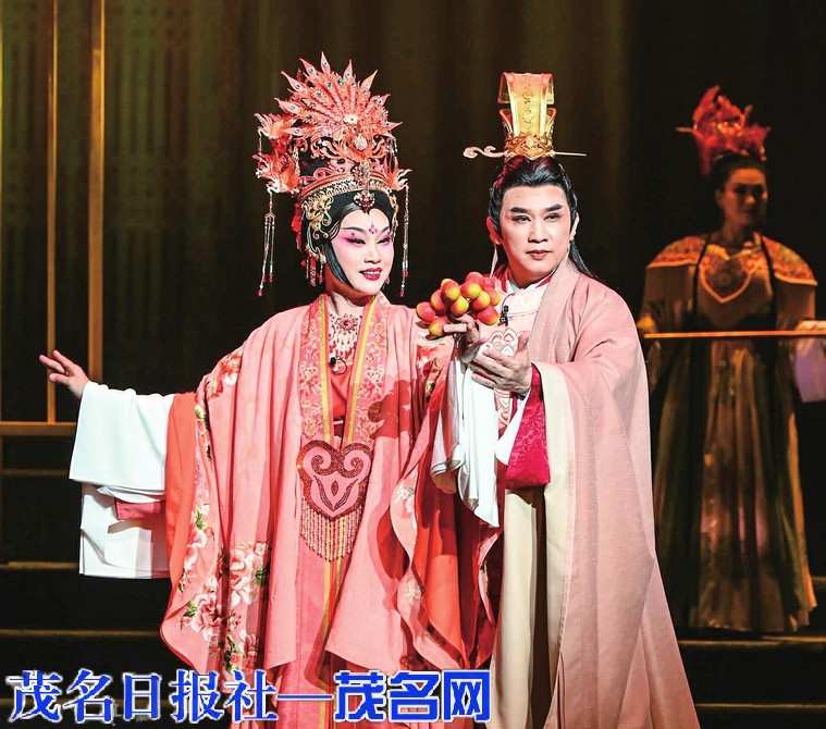 据介绍,该剧从构思、创作到首演历时一年多的时间,以茂名特色水果荔枝贯穿全剧,采用从古到今跨越千年的时空线,讲述了唐明皇为贺杨贵妃生辰,要求岭南之地的高州荔枝园进贡新鲜荔枝,主人公茂勇借助恋人红姑娘的“竹筒保鲜法”飞骑千里送荔枝的故事,并展现了茂勇和红姑娘可歌可泣的爱情。值得一提的是,该剧运用“粤剧+音乐剧”的新颖表现形式,最大化发挥粤剧程式技法的同时,在造型、音乐、舞美等方面大胆创新,并融入多媒体元素,充分展现我市群众大力拓展荔枝产业的奋斗之志、创造之力、发展之果,为观众带来耳目一新的视听感受。