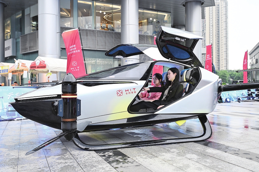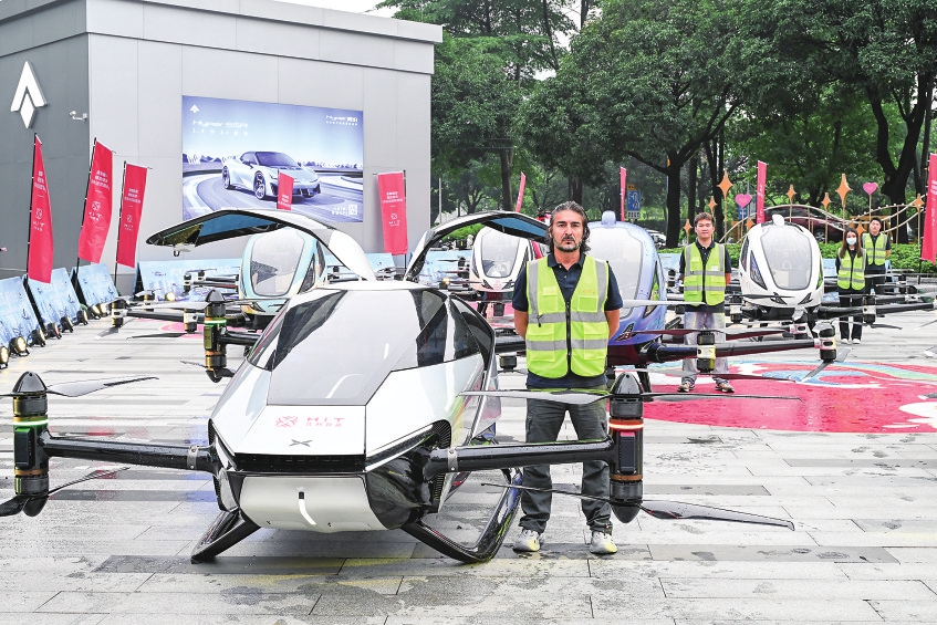 ▲6月3日,工作人员(右)在广州低空航展上向观众介绍小鹏汇天飞行汽车旅航者X2。新华社记者 刘大伟 摄