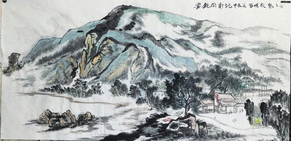 清明节期间,朱积陪深圳企业家和澳门科技大学的领导参观了第一滩晏镜岭和疍家墟,这些嘉宾对美好景观和茂名的发展趋势大加称赞。有感于疍家墟对晏镜岭周边乡村发展的带动作用,朱积先生萌生了创作一幅反映电白晏镜岭旅游开放及疍家墟民俗风情国画作品的念头。为了全面深入了解实地状况,更加生动准确刻画对象的出彩魅力之处。朱积多次从第一滩沿碧道走到晏镜岭海边,在礁石群拍照,收集海边各种形状石头;到晏镜岭山腰登高望远,目睹黄昏下童子湾千帆“归巢”壮美情景;到疍家墟观赏疍家人的民俗风情,追溯千年古韵文化;入网红酒店饮茶感受海边夜生活的浪漫情调,登上楼顶远眺水东湾全景风貌。无论从生活素材积累还是到亮点景象观察研究都下了一番功夫。晏镜岭是电白沿海一个集自然风光、历史文化一体的旅游景区,以其东南面临海,西北林带环抱的自然美景而闻名。疍家墟位于南海街道晏镜社区塘霞村,利用得天独厚的滨海生态资源,围绕俚俗文化、疍家文化、渔商文化等打造各具特色场景,形成了茂名“趁墟文化”网红打卡点。因此在创作这幅主题作品的基调上必须紧扣这两大元素做文章,突出当下电白滨海旅游开放呈现出新亮点、新样式、新作为,以可居可游可赏可玩的美丽滨海风情画卷展示世人。朱积是这样想的也是这样做的。在作品构图上,以横式篇幅把晏镜岭的宏伟壮观的山体摆在画面的中心位置,让人产生一种高山仰止的震撼感。在位置的经营安排上注意主与次,密与疏,重与轻,动与静等关系的分割配置。画面前方右角主要突出了疍家墟错落有致的商铺建筑、游客、商客、观光车的热闹场面。以“动、密、重”的物象元素构建疍家墟文化产业的新业态、新景象。画面左边留出一大片空白,展现出童子湾的壮阔空旷,海滩上添上几块大礁石后,空而不虚,虚中有物,呈现妥妥的海边特点。再者是画面前方的大树与巨石是这幅画的关键要素,既与后面的大山形成前后节奏关系,又稳住了前景物象不足的问题,避免产生首轻尾重的视觉效果。还有前景右角的一大片木麻王树不但体现了沿海林带特色,也弥补了位置过于空白无物。这幅画最精彩的亮点和画眼是网红酒店、红色小轿车、挑担小商贩,三者分别处于一个三角形位置,动静相连,遥遥呼应,串活了这幅画的生机与节奏,细看让人忍俊不禁,意领神会。