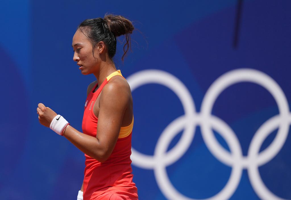 7月30日,郑钦文在比赛中庆祝得分。新华社记者 万象 摄