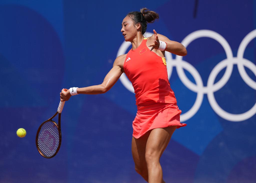 7月30日,郑钦文在比赛中回球。新华社记者 万象 摄