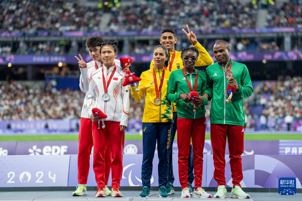 9月7日, 冠军巴西选手杰鲁萨·格贝尔·多斯·桑托斯(左三)和领跑员桑托斯·加西亚(右三)、亚军中国选手刘翠青(左二)和领跑员陈圣明(左一)、季军纳米比亚选手拉哈贾·伊希蒂利(右二)和领跑员塞姆(右一)在颁奖仪式上。