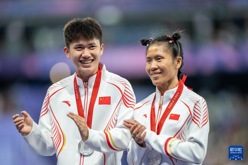 9月7日,中国选手刘翠青(右)和领跑员陈圣明在颁奖仪式上。