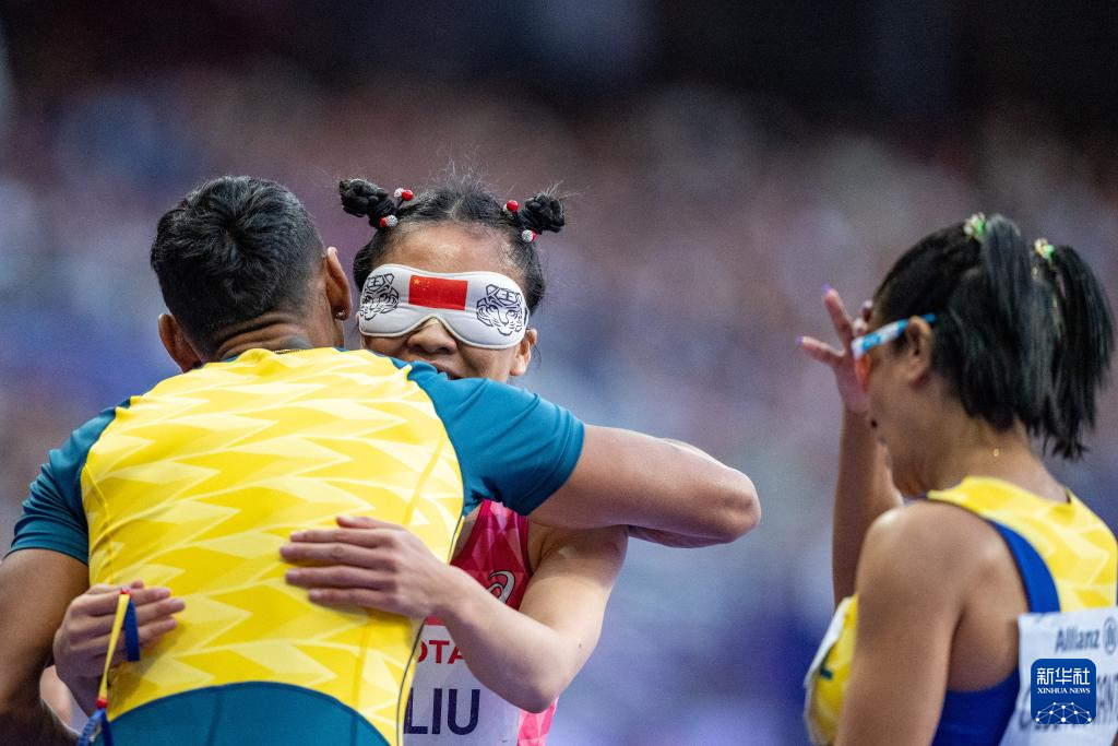 9月7日,中国选手刘翠青(中)在比赛结束后与巴西选手杰鲁萨·格贝尔·多斯·桑托斯(右)的领跑员桑托斯·加西亚拥抱致意。