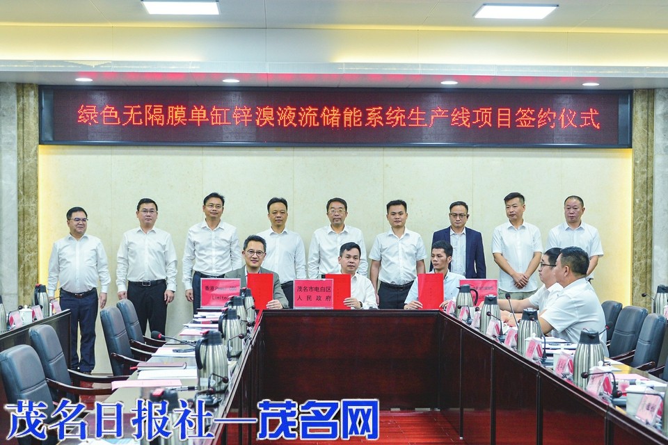 仪式上,电白区分别与相关企业签约了风光绿能源网荷储一体化项目、绿色双零循环再生锂电池无害化生产线项目和绿色无隔膜单缸锌溴液流储能系统生产线项目。