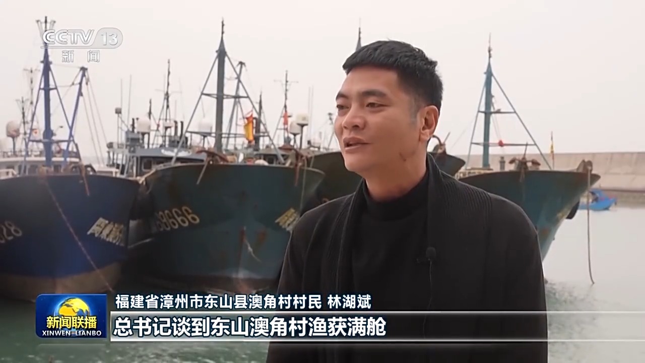 福建省漳州市东山县澳角村村民 林湖斌:在新年贺词中,总书记谈到东山澳角村渔获满舱,让我非常感动,也干劲十足。现在是年节期间,正是海产品的销售旺季,订单也是越来越多。我们要撸起袖子加油干,让我们海洋渔业发展得更好,把我们澳角村建设得更美好。