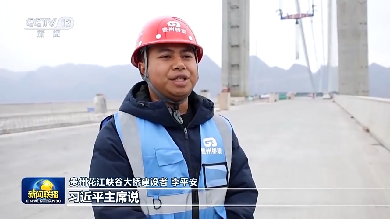 贵州花江峡谷大桥建设者 李平安:习近平主席说,新征程上,每一个人都是主角。我觉得非常自豪,心里也感到非常温暖。我们正在建设的花江峡谷大桥春节前后即将合龙,将是世界第一高桥。我们一定会认真细致,高质量地完成工程任务,把中国式现代化的美好愿景,书写在祖国的山川河流之间。