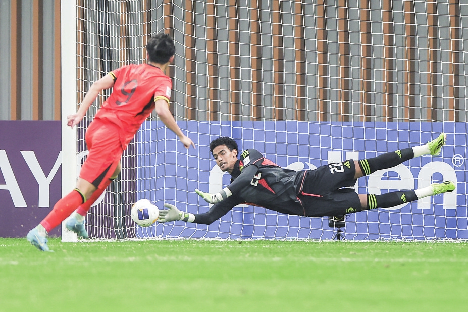 ▲2月22日,中国队球员刘诚宇(左)的点球射门被沙特阿拉伯队守门员哈米德·阿卜杜拉·优素福扑出。新华社记者 毛思倩 摄