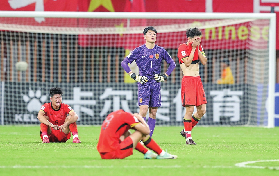 ▲2月22日,中国队球员彭啸(左一)、史松宸(右一)和守门员刘骐玮(右二)在比赛结束后难掩失落。新华社记者 李旭伦 摄