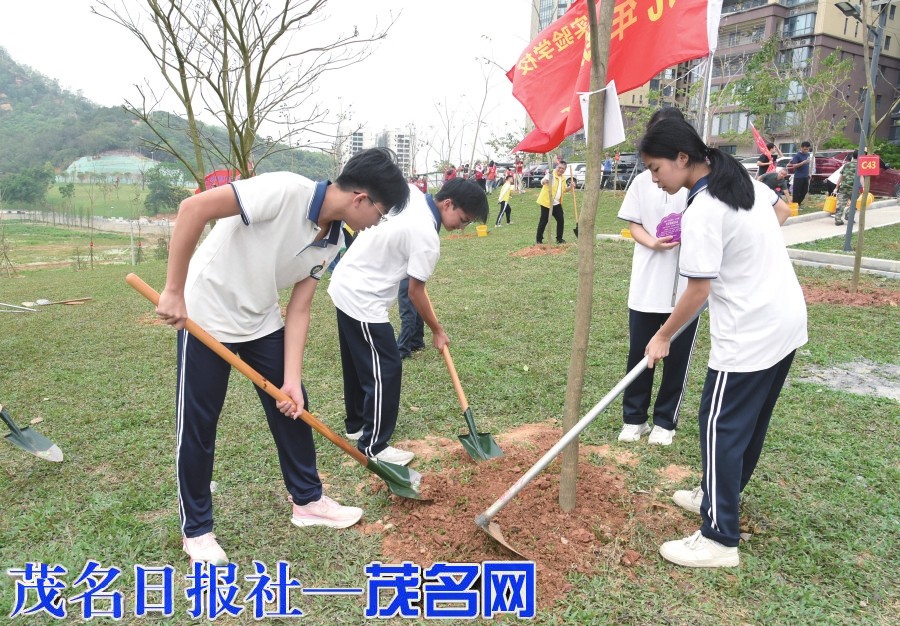 当天,有一支植树队伍格外引人注目,他们是来自高州市金山实验学校的师生代表,他们分工协作,挥锹铲土、扶苗定植、培土夯实,泥土的芬芳与青春的汗水交织,为“绿美茂名”建设注入年轻力量。