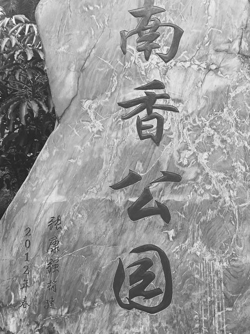 初春时节,作此文之前,我又一次来到南香公园,细细品味她独特之美。南香公园虽面积不大,可谓十分精致。从西粤路门口进入公园,正门前的健身广场颇宽阔。中东海枣树,细叶榕树站两旁。往前走,见一花圃,巨大的黄蜡石赫然入目,其上刻着“南香公园”四个大字,右下角刻有“张康强捐建,2012年春”字样。绕花圃一圈,方觉其大。圃内有圆球状的灰莉、蜘蛛兰之类绿植,其中最惹眼的还是那健硕的中东海枣树。站在广场,园内美景尽收眼底。一群大娘正在翩翩起舞,舞姿娴熟好看,看得我啧啧称羡,跃跃欲试,好想上前跳上一曲。