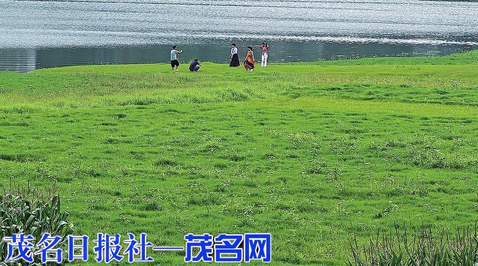从平山镇驱车前往大仁庙方向,在大仁庙加油站左转进入塘铺村,一片开阔的临水草坡跃入眼帘。绒毯般的细草顺着水岸绵延,与波光粼粼的水库相映成趣。5月27日下午,记者在现场看到,8名来自高州市区的游客正举着手机在草坡上奔跑嬉戏,拍摄短视频。“草甸踩上去软绵绵的,背景有山有水,随手一拍都是大片!”一名游客兴奋地说道。据塘铺村村民李大哥介绍,村前与柴坡村前有两片草坡,因草种不同呈现独特层次感,村前的草坡被浸时,柴坡村前的草坡仍可见。近日虽因雨水导致水位上涨,但晴日时“草色连水景更靓”。