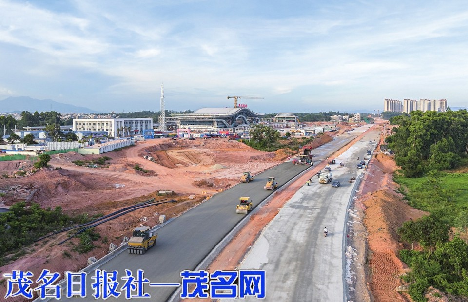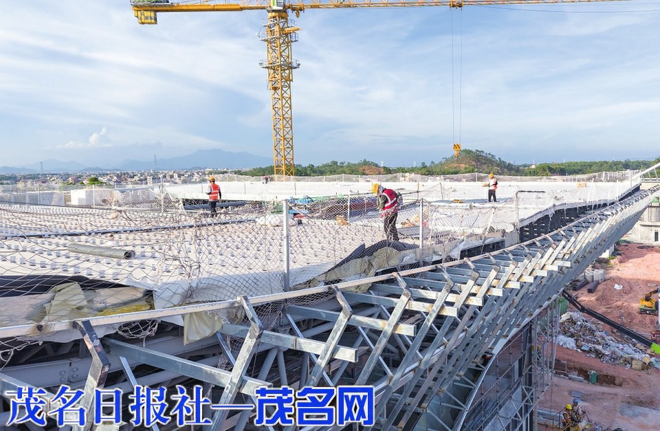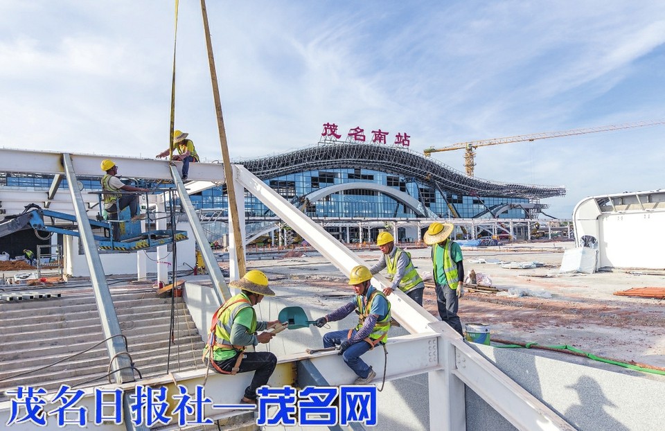在骄阳似火的天气里,建筑工人们坚守岗位,为这座重要交通枢纽的建成全力冲刺。 记者从施工现场见到,茂名南站周边道路施工有序推进,大型工程车辆往来穿梭,压路机、摊铺机等设备协同作业,工人们在路面摊铺等环节细致操作,保障道路基础工程质量。站房及配套设施建设中,塔吊高悬,工人们分布在不同作业面,有的在搭建钢结构框架,有的进行屋面施工,他们身着安全装备,在高温下专注作业,用汗水加速项目建设。