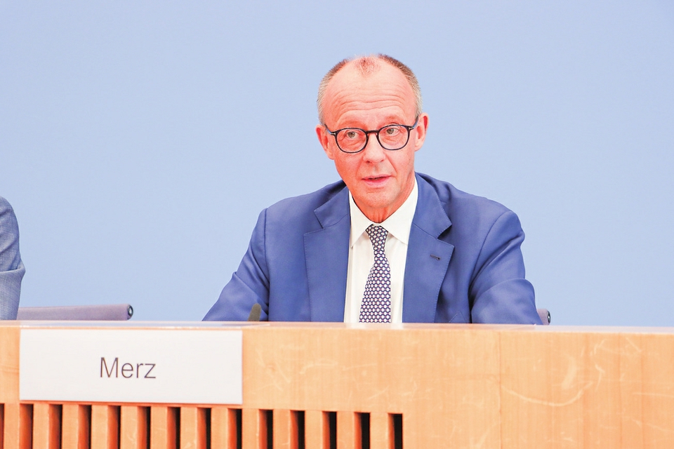 7月18日,德国总理默茨出席在柏林举行的夏季新闻发布会。新华社记者 李函林 摄