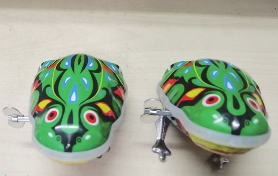 铁皮青蛙,顾名思义,就是铁皮做成的青蛙。它为什么会蹦会跳呢?因为这种青蛙是由发条驱动的。