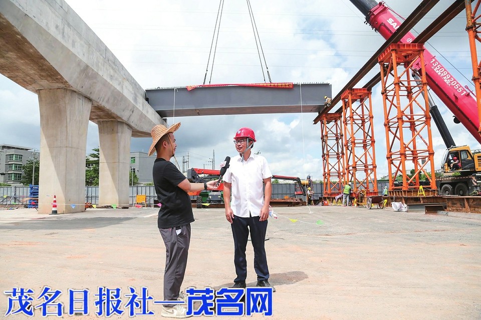 “各岗位注意,起吊倒计时3、2、1!”当天上午10时许,在首吊作业区域,各岗位施工人员身着反光背心,各司其职,有序开展吊装工作。随着技术支持单位茂名鼎鑫机械公司的起重机缓缓启动,钢箱梁在吊钩的牵引下平稳升空,在空中完成转向、平移等一系列动作。现场技术人员实时监测钢箱梁的位置偏差,指挥人员通过对讲机精准下达操作指令,经过紧张作业,钢箱梁成功落位在计划的桥墩支座。“市民大道第10联第30跨的钢箱梁总长55米,宽28米,分纵向3个节段横向4个箱室共12节段进行吊装。今天吊装的这榀梁长为18.75米,重35吨,是该跨最长最重的一榀。本次成功吊装是本项目取得的突破性进展。”中建八局南方公司省道S280线(茂名大道)快速化改造项目总工程师叶安铭表示。