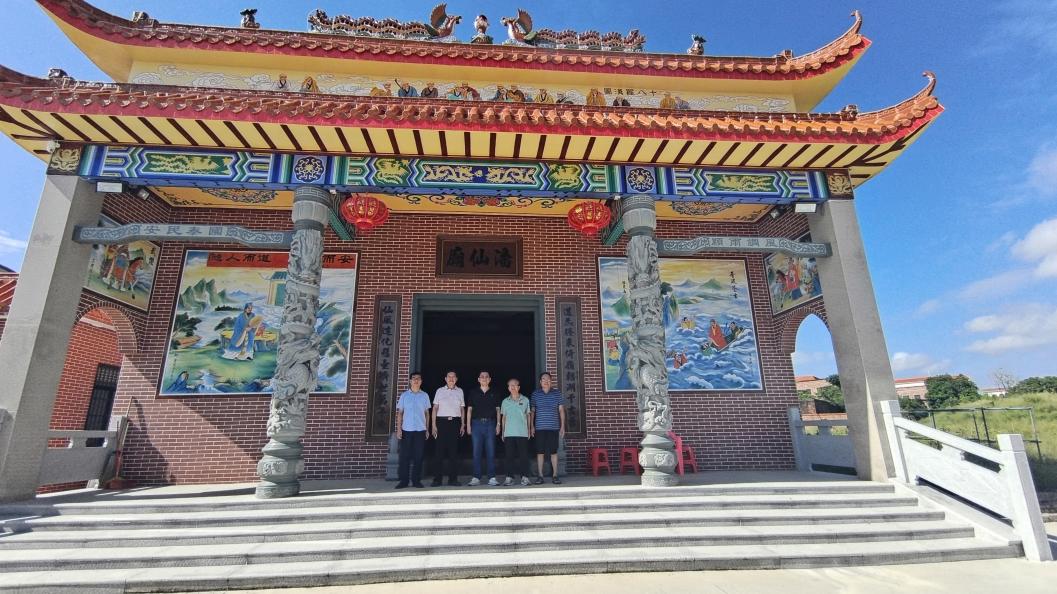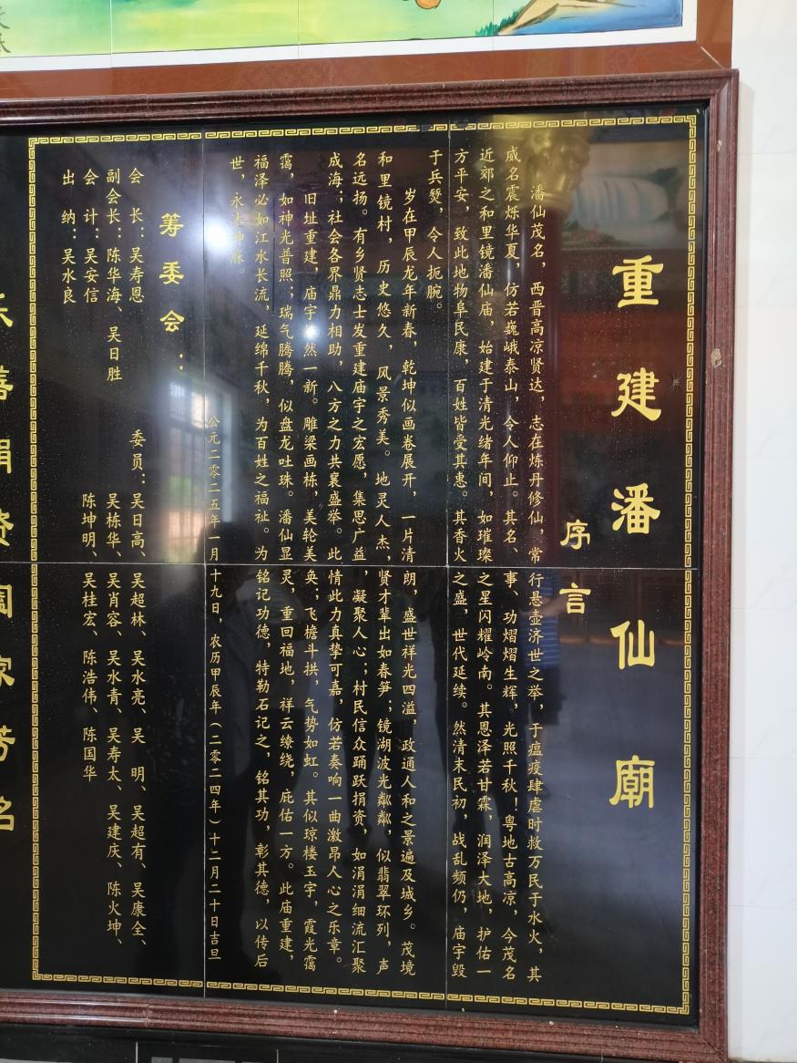 潘茂名文化研究团队专程考察茂南禾里镜村潘仙庙。这座“潘仙庙”,是茂南区目前发现第一座专祀潘茂名纪念性建筑,始建于清朝光绪年间,近年在遗址重建。庙宇为二进岭南风格硬山顶建筑,庄重堂皇,主要建筑为枣红色墙体。庙宇内墙雕刻有“普渡众生”“凿石造船”“观山炼丹”等壁画,香火缭绕。室外有专栏“重建潘仙庙序”。