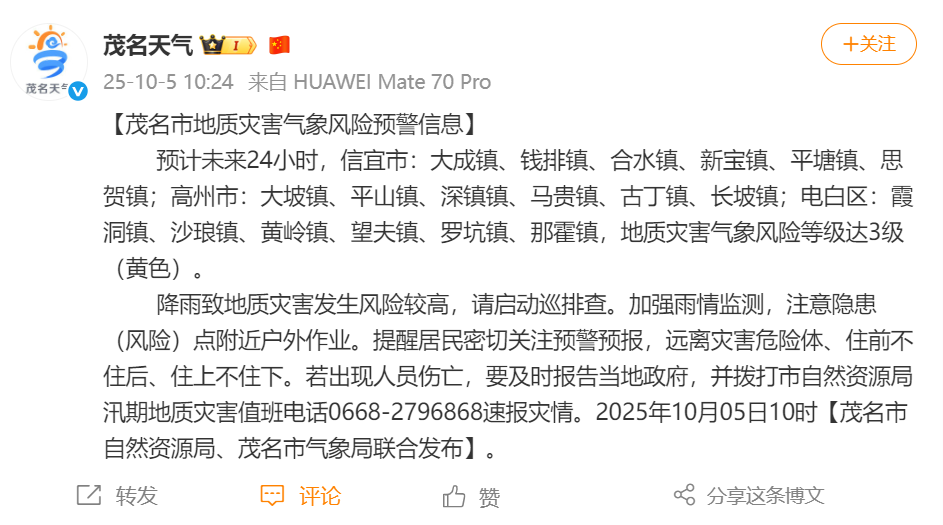 【茂名市地质灾害气象风险预警信息】预计未来24小时,信宜市:大成镇、钱排镇、合水镇、新宝镇、平塘镇、思贺镇;高州市:大坡镇、平山镇、深镇镇、马贵镇、古丁镇、长坡镇;电白区:霞洞镇、沙琅镇、黄岭镇、望夫镇、罗坑镇、那霍镇,地质灾害气象风险等级达3级(黄色)。
