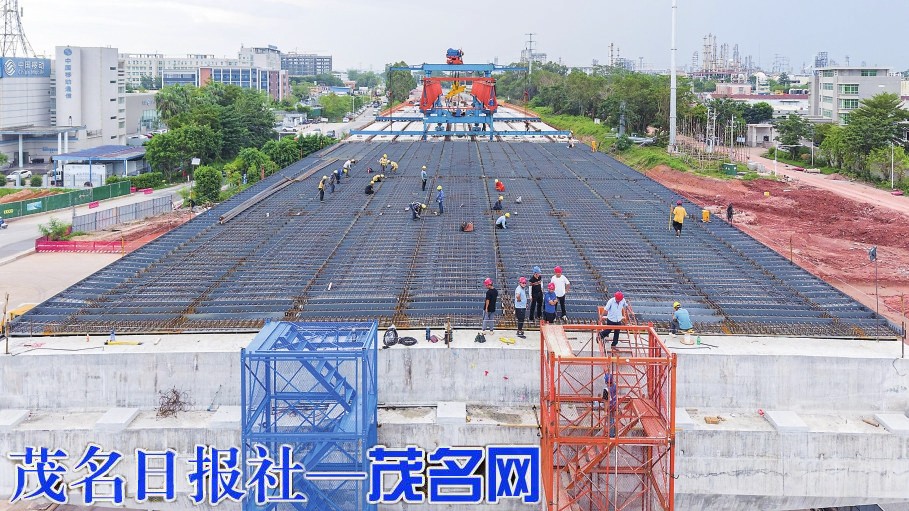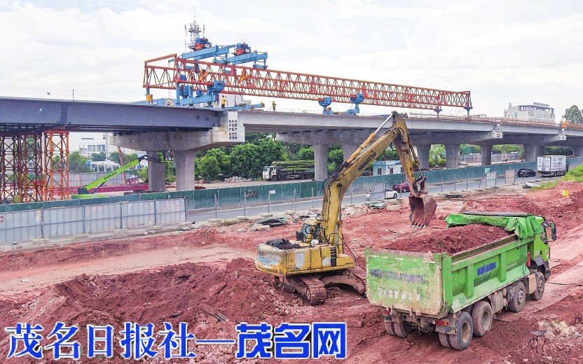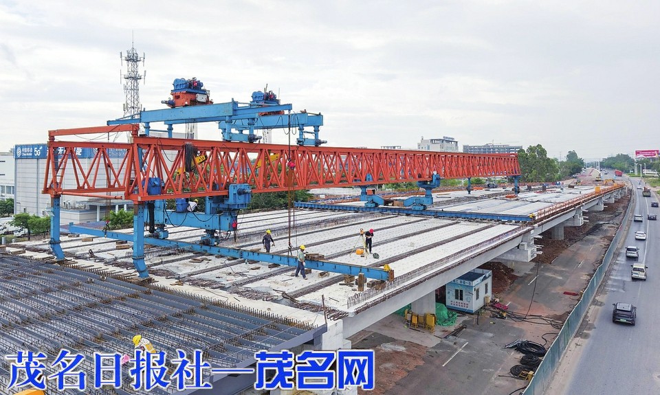 茂名网讯 架桥机巨臂横空,钢筋网纵横交错,茂名市民大道立交桥面施工现场一片繁忙景象,城市立体交通网络正加速成型。