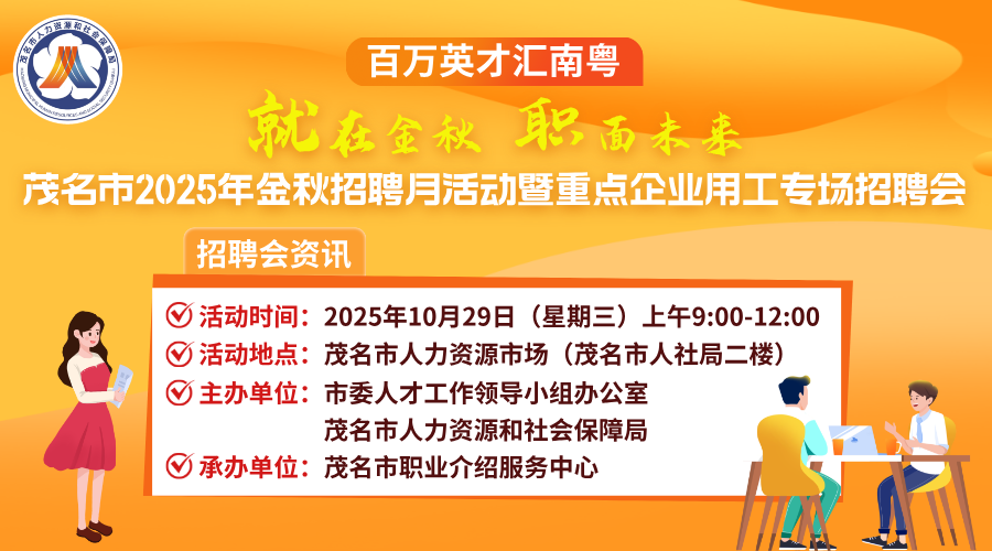 为充分发挥人力资源社会保障部门保企业用工、稳就业形势作用,助力茂名市重点企业招才引智,促进高校毕业生等重点就业群体高质量充分就业。茂名市人力资源和社会保障局定于2025年10月29日上午9:00-12:00在茂名市人力资源市场举办“百万英才汇南粤”“就”在金秋 “职”面未来 茂名市2025年金秋招聘月活动暨重点企业用工专场招聘会,欢迎各用人单位踊跃报名参会。