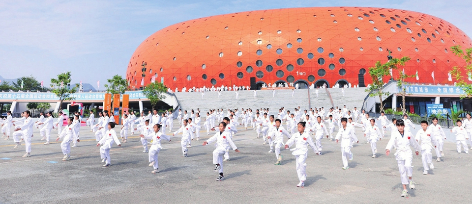 ▲四会市体育中心体育馆举办“柔道之城”万人柔道操大型展演活动。