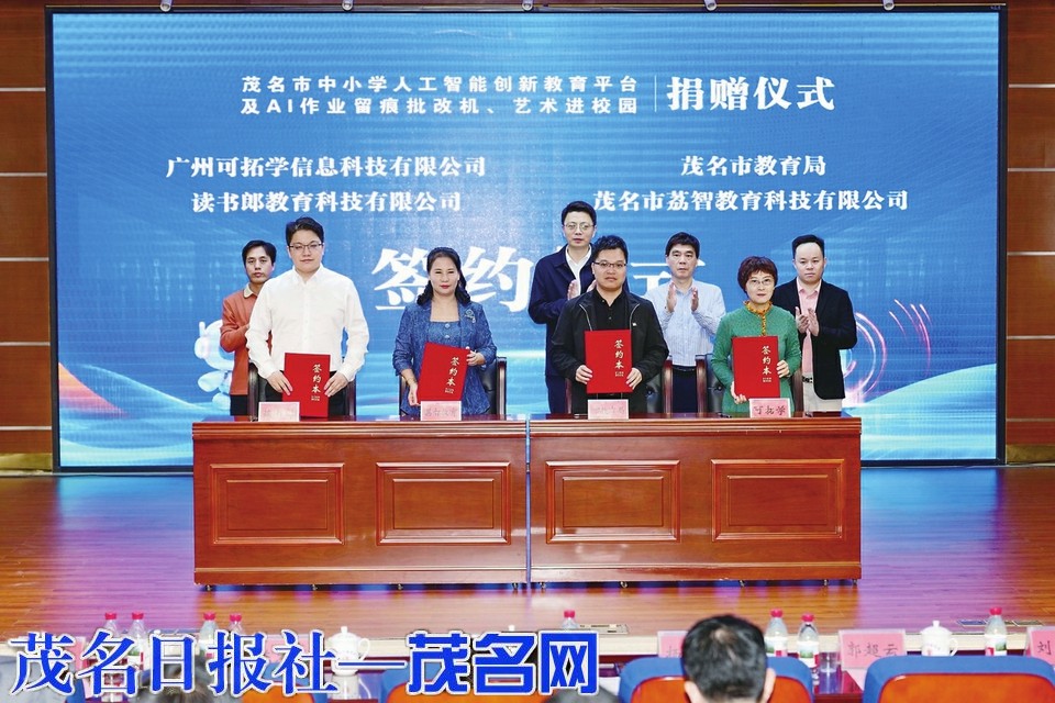 茂名网讯 11月4日下午,“赋能教育智能化,共创茂名新未来——茂名市中小学人工智能创新教育平台及AI作业留痕批改机、艺术进校园捐赠仪式”在市教育局附属楼二楼报告厅举行。此次活动既是社会力量支持区域教育高质量发展的生动写照,也是茂名市推进“智能+教育”深度融合,构建高质量教育体系的关键举措。