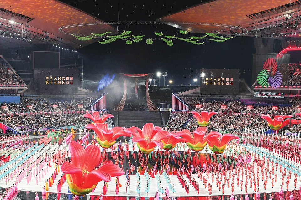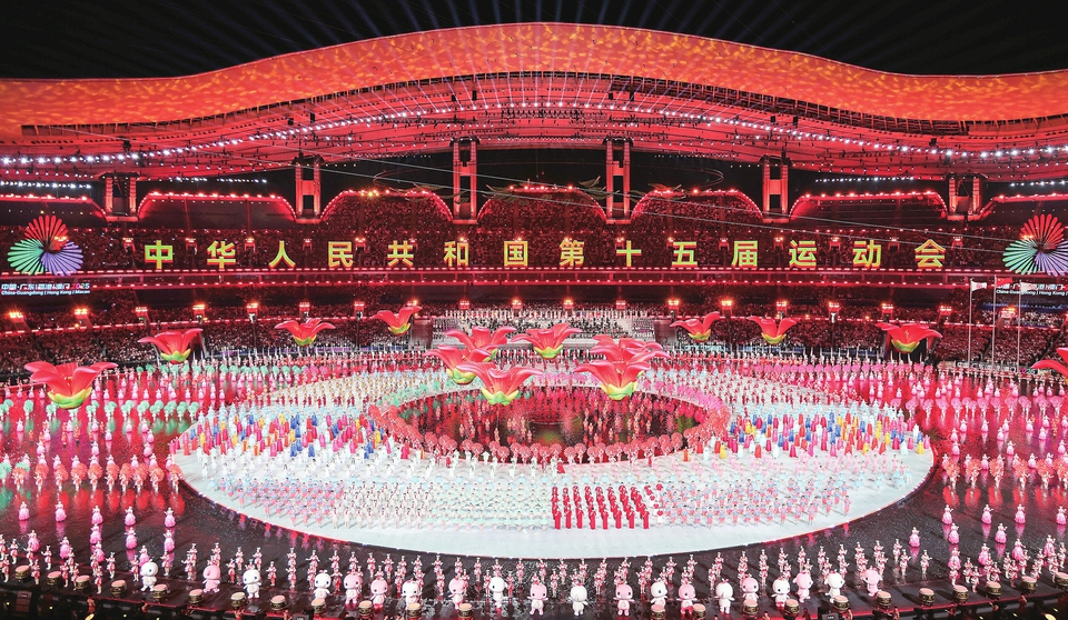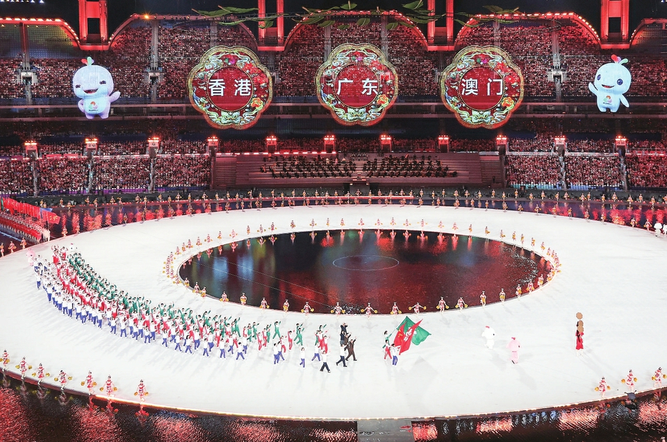 9日晚的广东奥林匹克体育中心华灯璀璨,气氛热烈。这是首次由粤港澳三地联合举办的全国运动会。