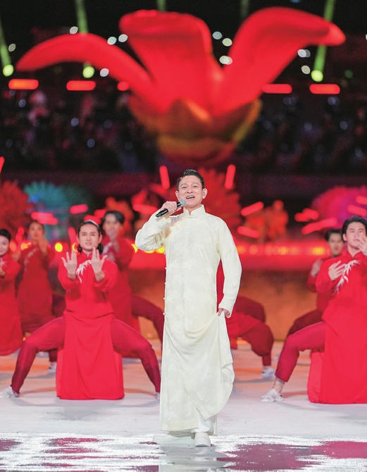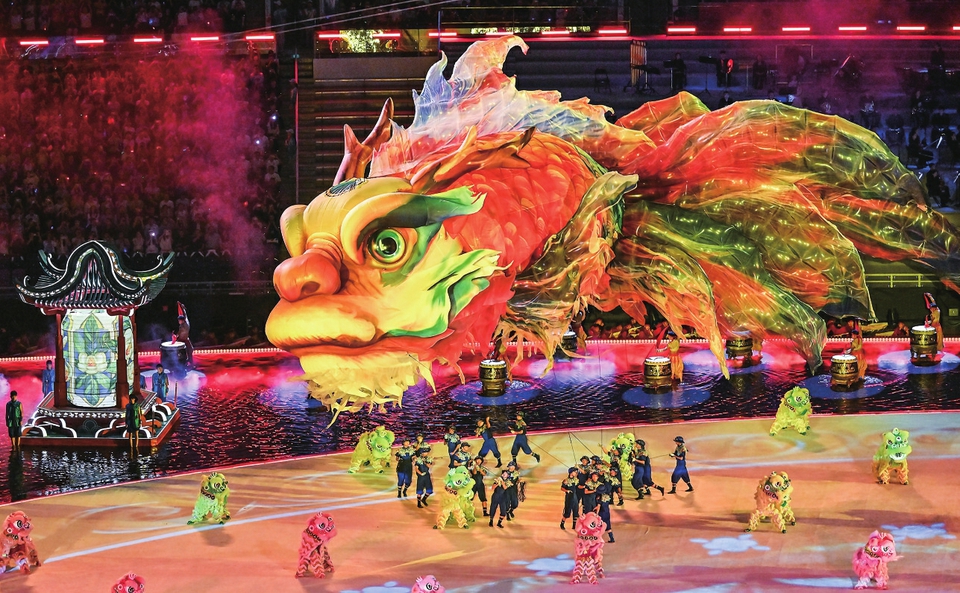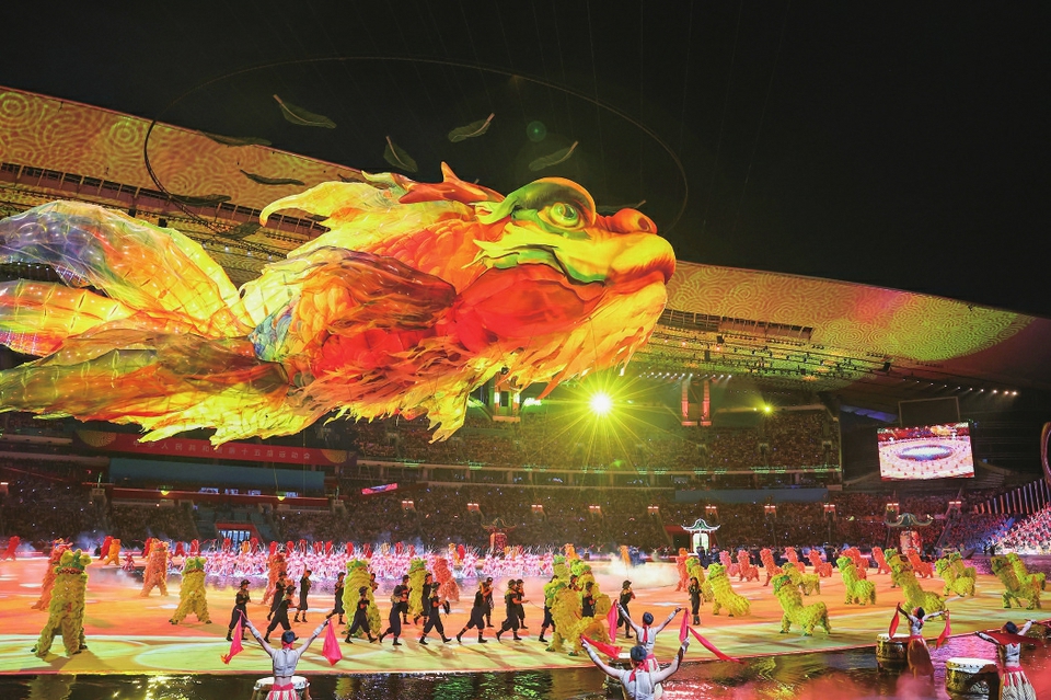 以《圆梦未来》为主题的文体展演拉开序幕。整个演出由“同根同源”“同心同缘”“同梦同圆”3个篇章组成,创新运用体育元素、艺术手段和前沿科技,生动诠释了本届全运会“激情全运会,活力大湾区”的主题。