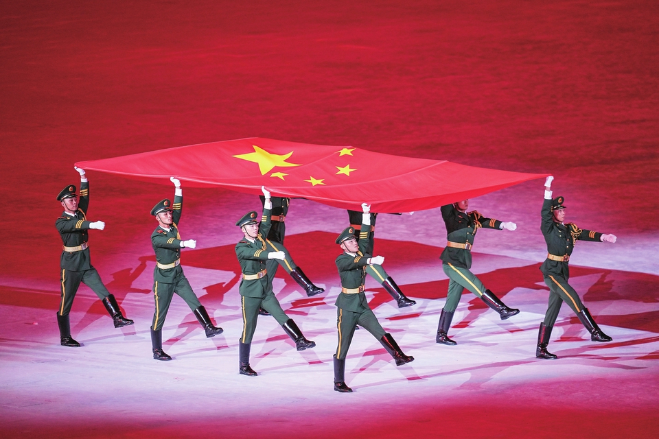 入场仪式完毕,全场起立,高唱中华人民共和国国歌。在雄壮的国歌声中,五星红旗冉冉升起、高高飘扬。
