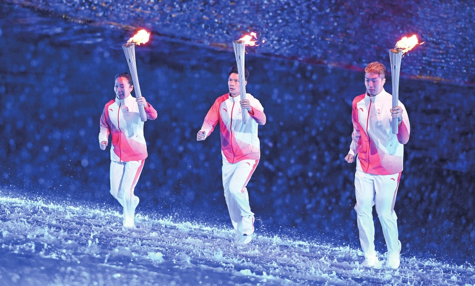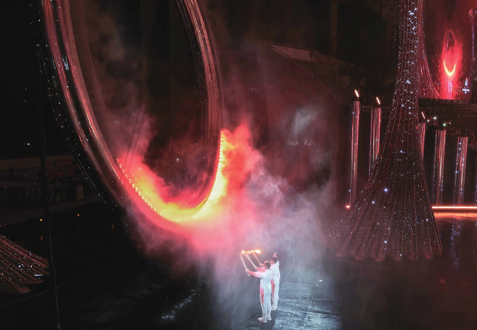 ▲11月9日,火炬手苏炳添(中)、张家朗(左)、李祎点燃主火炬。 新华社记者 黄伟 摄