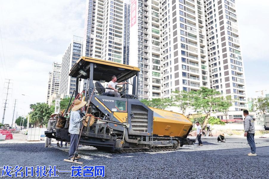 下午3时许,官山六路施工现场一片繁忙。沥青摊铺机稳步推进,压路机紧随其后往返压实。南半幅路面已完成首层沥青摊铺,北半幅施工同步进行。站在官山六路西粤路口向东望去,一条笔直宽阔的道路已初具雏形,直抵茂名大道,“断头”即将成为历史。