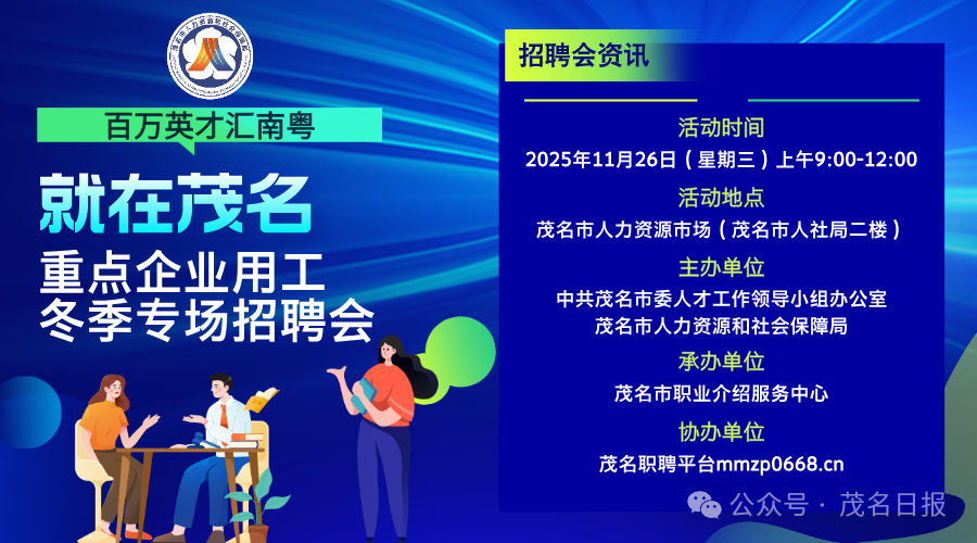 为充分发挥人力资源社会保障部门保企业用工、稳就业形势作用,助力茂名市重点企业招才引智,促进高校毕业生等重点就业群体高质量充分就业。中共茂名市委人才工作领导小组办公室、茂名市人力资源和社会保障局定于2025年11月26日上午9:00-12:00在茂名市人力资源市场联合举办“百万英才汇南粤” 就在茂名——重点企业用工冬季专场招聘会,欢迎各用人单位踊跃报名参会。
