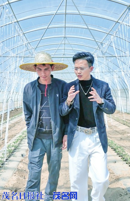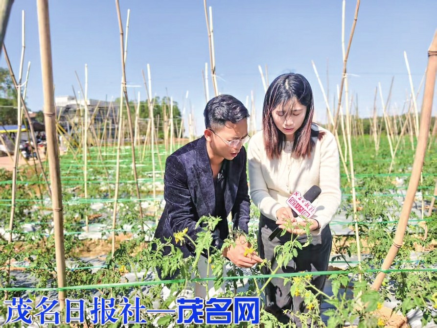 在这片生机勃勃的土地上,一位戴着眼镜的年轻人格外引人注目。他蹲下身,轻轻托起一颗刚转色的小番茄,仔细端详着果实的色泽、形状,又用手指轻触感受果实的硬度。他是茂名市农协副会长、电白区新阶联副会长、万鼎农业董事长梁国珊,一个在外乡打拼多年又回到电白的“新农人”。