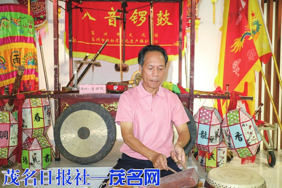 近日,记者来到高州市非物质文化遗产展览厅,见到了省级非遗项目八音锣鼓代表性传承人林继衡。八音锣鼓亭(柜)就放在展厅的一角,亭上放着文锣、高边锣、笛子、洞箫、二胡、小鼓、长号、唢呐……旁边还放着花灯、彩旗、罗伞、御扇等道具,它们此刻收敛着所有的喧闹,只等“掌板”一声“令”下,便会八音相会,鼓乐齐鸣。