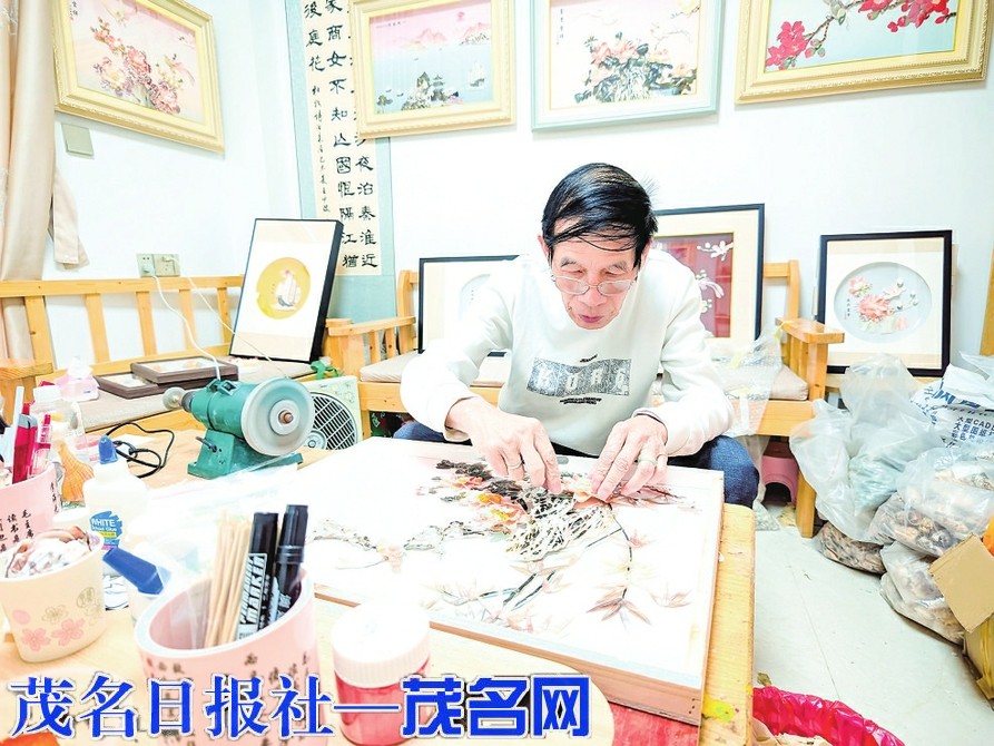 在电白区霞洞永乐村一座不起眼的平房内,可以看到贝壳立体摆件栩栩如生,艺术看盘精美绝伦,贝雕挂画意境悠远。这些散发着海洋气息的艺术品,见证着一位非遗传承人数十年的坚守与创新。他就是莫善玉——电白贝雕传承人,是一位用毕生心血守护和发展这门传统技艺的匠人。