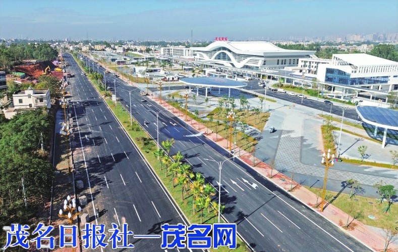 当天上午,阳光明媚,记者在茂名南站广场看到,紧邻广场旁的一条宽阔崭新的双向六车道黑底大道,就是百越大道,它如巨龙一样从东往西蜿蜒而来,两头分别连接上潘州大道与茂名大道。约大路中段北侧,正是迎着朝阳将要开通营运的茂名南站。大路上标线黑白分明,平整干净,路灯已安装完毕,路中隔离带和路两侧,大部分绿化树已插种稳妥,红色衬着嫩绿或淡黄,高低错落有致,十分养眼。现场一位正在丁字路口安装红绿灯的工人说,“约过两天可全部完工”。一列高速列车在旁边铁路飞驰而过,发出轰鸣,像要沸腾着整个站场和整条大路。