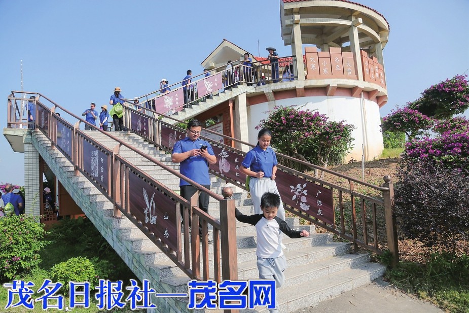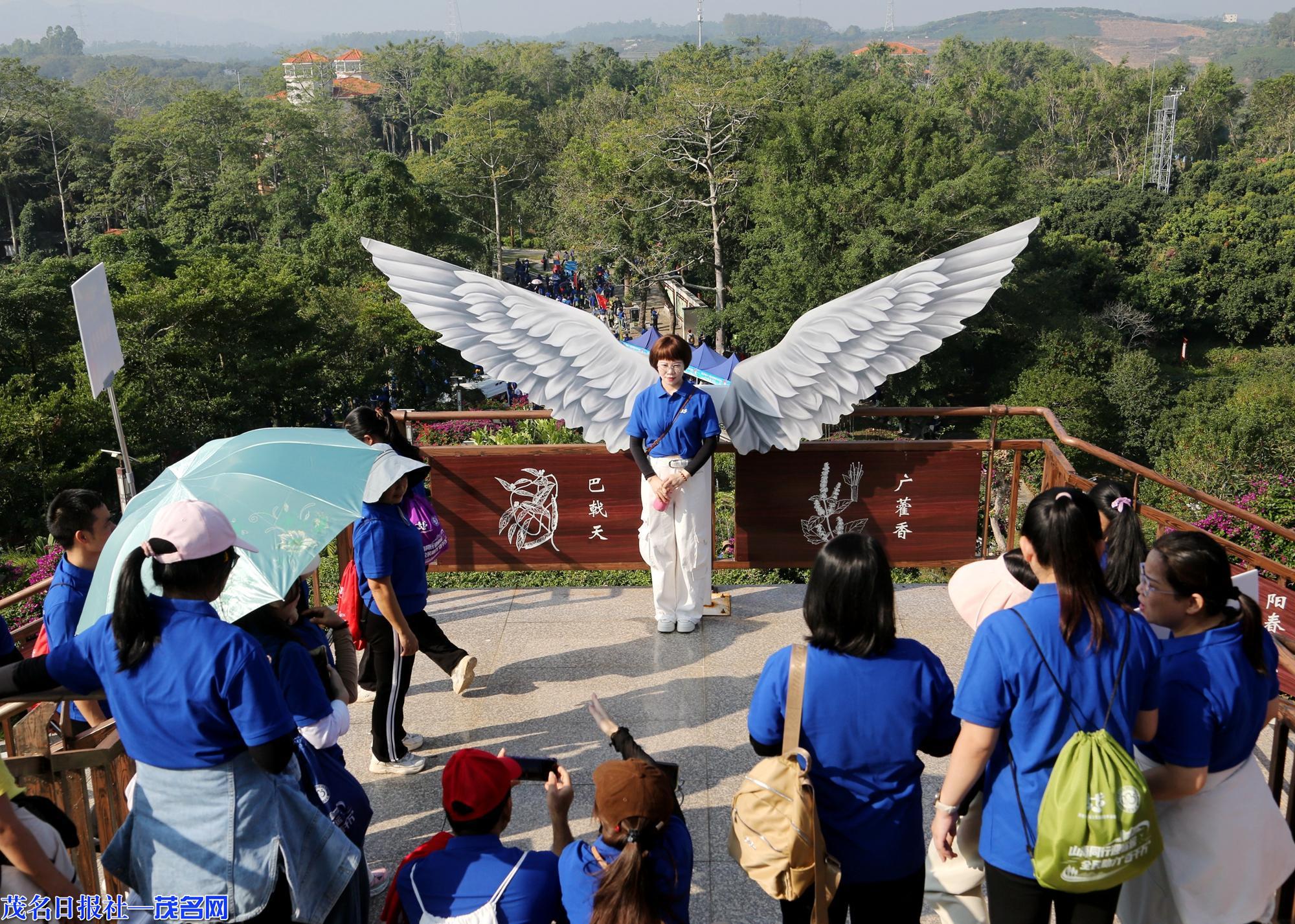 沿着清晰的线路指示牌前行,穿过绿树林荫小道,徒步者来到了首个特色景点油茶博物馆。博物馆四周绽放的红山茶花、白柴籽花,让大家纷纷化为“花蝴蝶”上前欣赏、闻香或拍照。继续前行,徒步者深入50000平方米的种植大棚,近距离观赏特色南药,领略现代南药种植与农光互补的科技魅力;在“24节气”药亭登高望远,一览绿树红花的自然景色,尽赏热带农业与南药美好风光;到达中央广场,又甜蜜打卡特色婚姻户外登记颁证点,“沉浸式”感受新时代的文明婚尚。一对中年夫妻在白色爱情阶梯上合影后,马上通过微信分享给家人。他们说:“现在茂名有很多个特色婚姻户外登记颁证点,很有仪式感,又新潮简单,值得推广。”