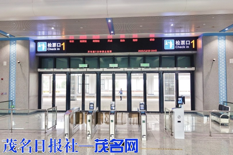 走进候车大厅,仿佛踏入一幅流动的海洋画卷。蓝白交织的色调清新雅致,带来海风拂面般的舒适惬意。一楼吊顶的“星辰大海”波浪线条灵动舒展,二楼“渔光织梦”的弧形设计,既大气美观,又巧妙呼应茂名拥有“广东第一大渔港”的城市名片。坐在候车厅中,静静地朝窗外看去,弧形玻璃幕墙将天光与城市风景温柔纳入,既节能环保,又营造出通透开阔的空间意境。