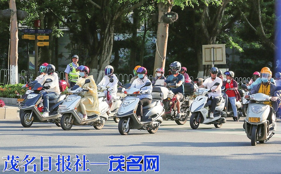 市民佩戴安全头盔,有序出行。茂名日报社全媒体记者 岑稳 摄