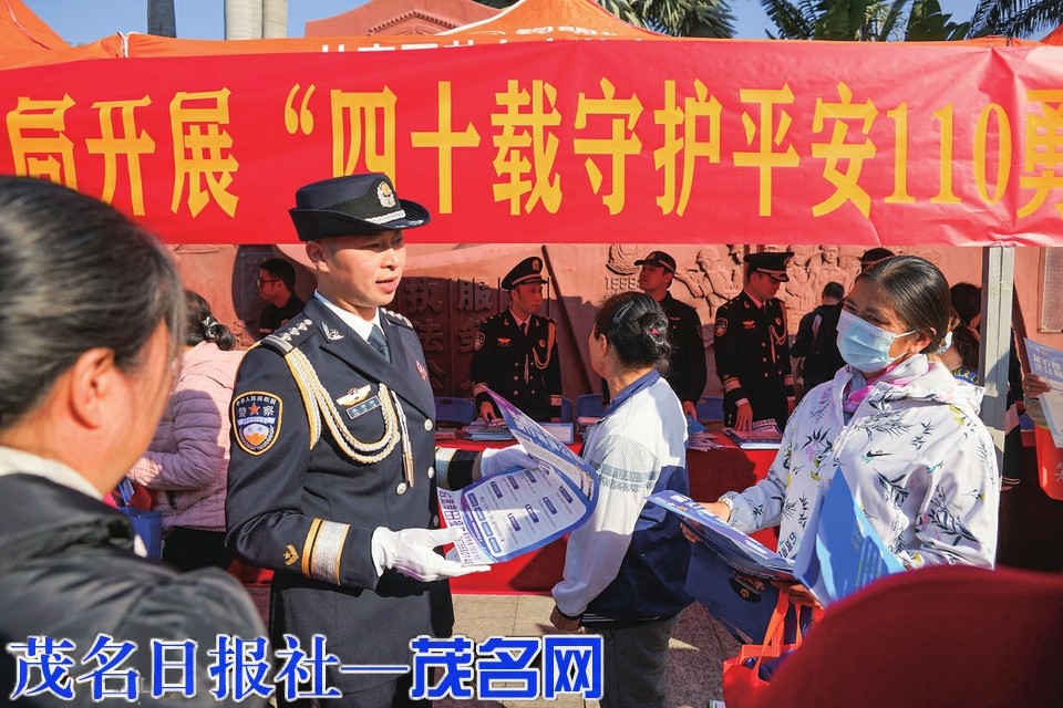 当天,电白公安还在水东街道西湖广场开展“四十载守护平安110勇毅前行”为主题的集中宣传活动,民警通过悬挂宣传横幅、摆设宣传展板、发放宣传资料、接受群众咨询等方式,向群众大力宣传防盗、防抢、防骗以及交通安全、反诈禁毒等相关知识,耐心解答群众关于车管、出入境、户政、便民措施等相关业务的咨询。