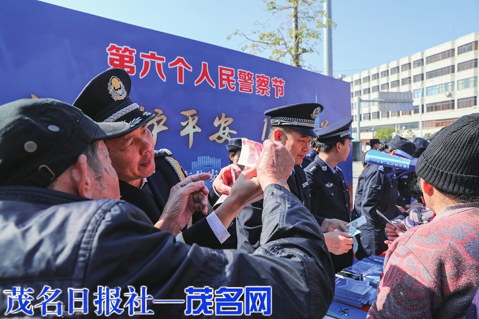 茂南公安分局民警与市民互动,给市民派发宣传资料。通讯员 杨杰宏 摄