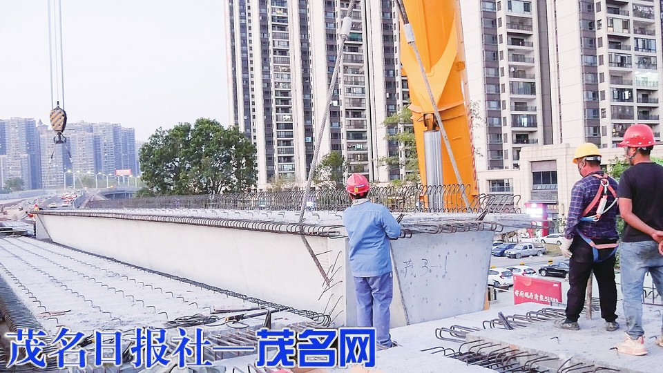 茂南大道立交最后一片箱梁架设中。