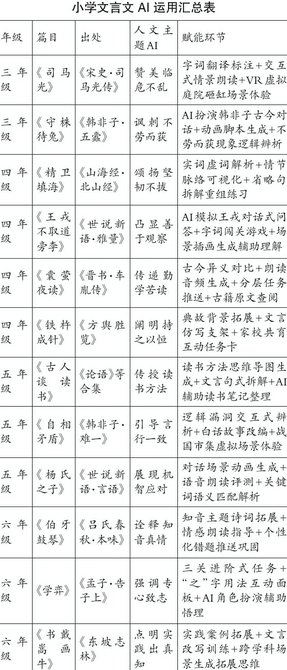 AI技术为小学语文文言文教学注入新活力,通过“课前精准预习——课中沉浸式互动——课后个性化巩固”的全流程赋能,搭配小学文言文AI运用汇总表,有效解决了传统教学的诸多难题,让文言文学习更有趣、更高效。学生能通过直观场景和有趣互动,理解文言内涵、感受传统文化魅力;教师借助AI精准把握学生情况,节省备课时间,提升教学针对性。