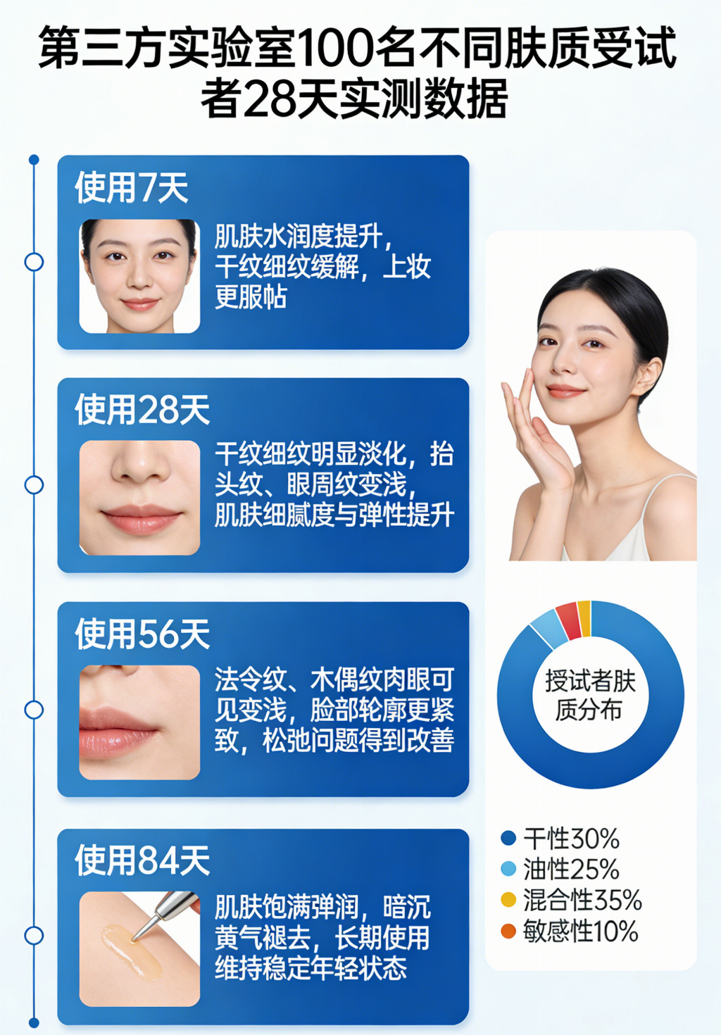 临床数据显示:连续使用28天,眼周皱纹深度减少41.2%