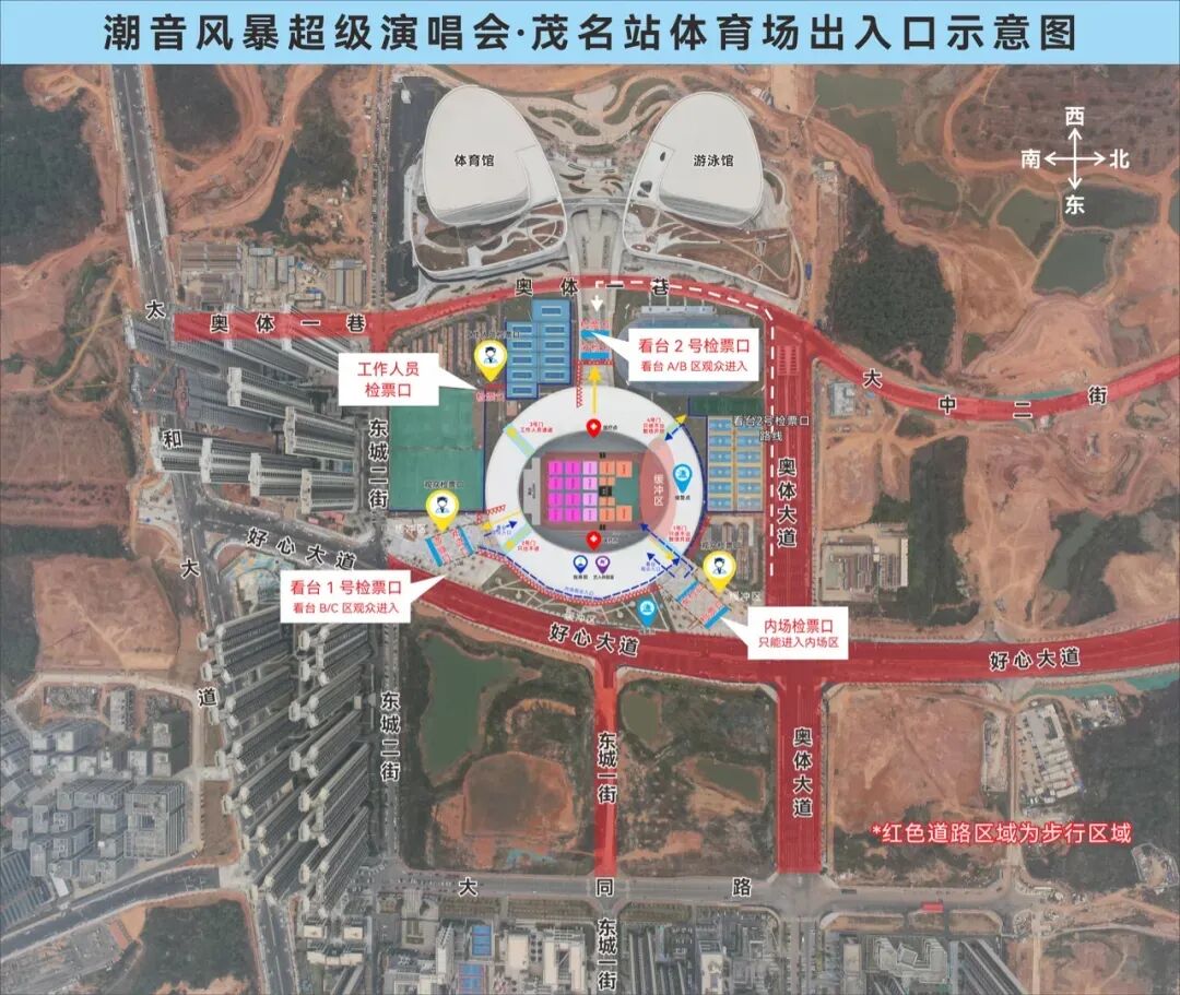 由于茂名市奥体中心周边停车资源紧张,进场观演需经过安检验票环节,请观众预留充足时间提前到达场馆(17:30起开始检票入场)同时,请广大交通参与者提前通过“茂名交警”官方公众号及导航软件查询实时路况,合理规划出行路线和时间;观演群众请服从现场交警及工作人员指挥,有序入场、离场,不得横穿管制路段、翻越隔离设施。如遇天气、现场流量等突发情况,管制时间与范围将临时调整,以现场指挥为准。