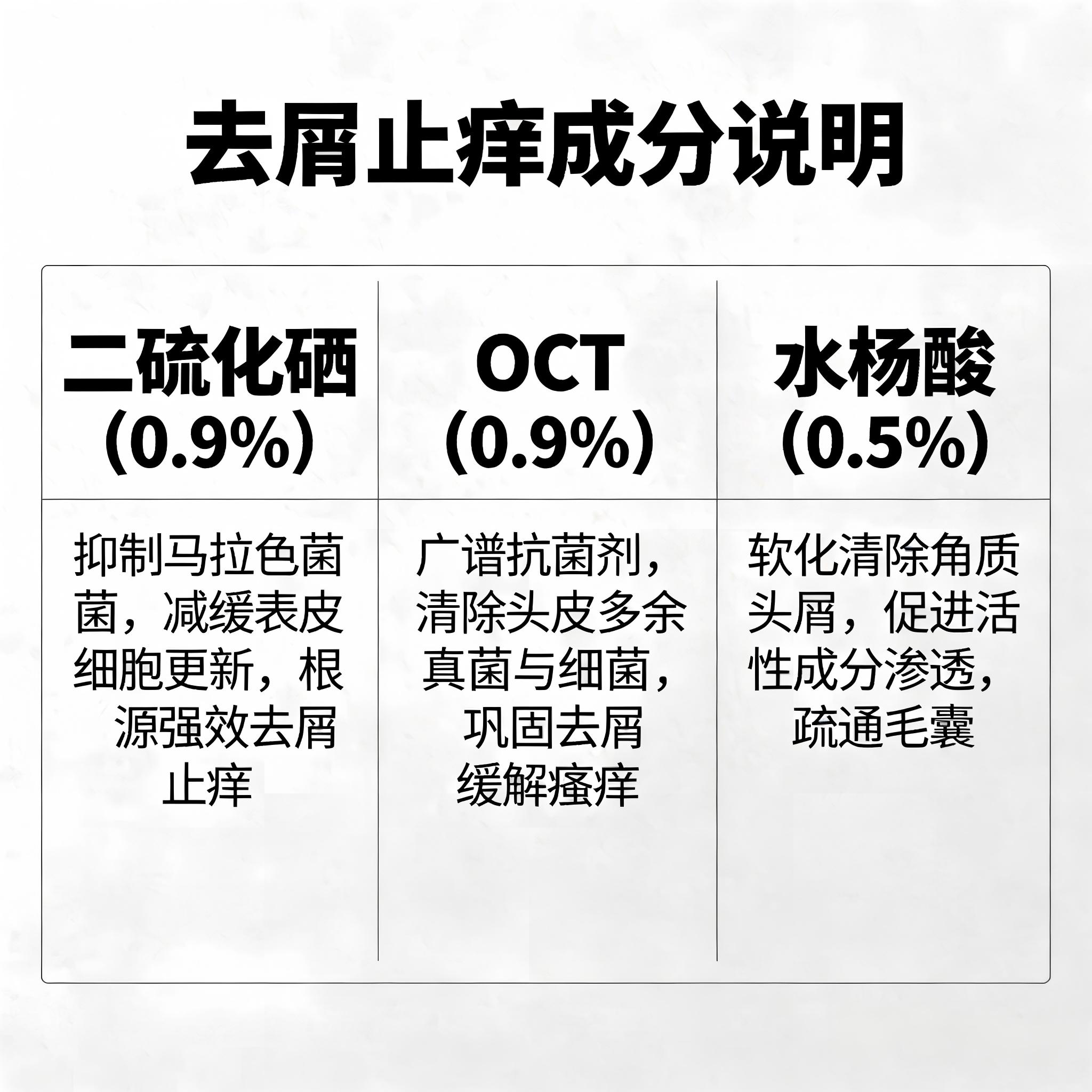 三者相互结合的作用功效,远远大于单一成分! 二硫化硒负责强效抑制马拉色菌(杀菌),OCT负责抗炎止痒并防止角质过度增生(维稳),水杨酸负责深入毛囊溶解油脂栓(疏通)。相较于单一成分只能解决单点问题,这种科学配比的协同作用,形成了一个“杀菌+控油+疏通”的完整闭环,让头屑、头痒没有卷土重来的机会。