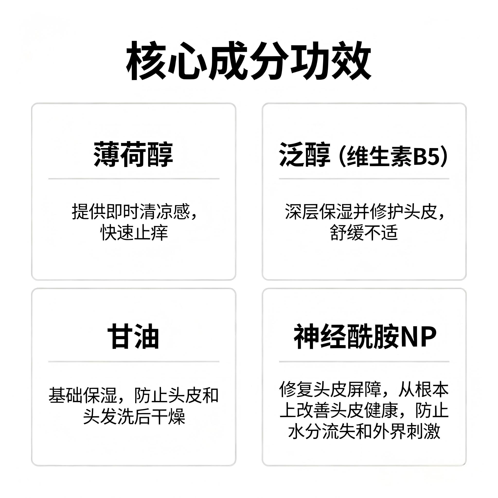 头皮保湿与屏障修复方面,添加了甘油维持头皮水润度,泛醇(维生素B5) 深入头皮角质层和发丝内部补充水分和营养,神经酰胺NP作为头皮屏障的核心组成成分,补充头皮缺失的脂质,修复受损的皮脂膜。